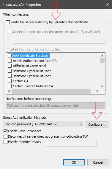 In the "Protected EAP Properties" window remove the tick at the "Verify the Servers identity ..." option.