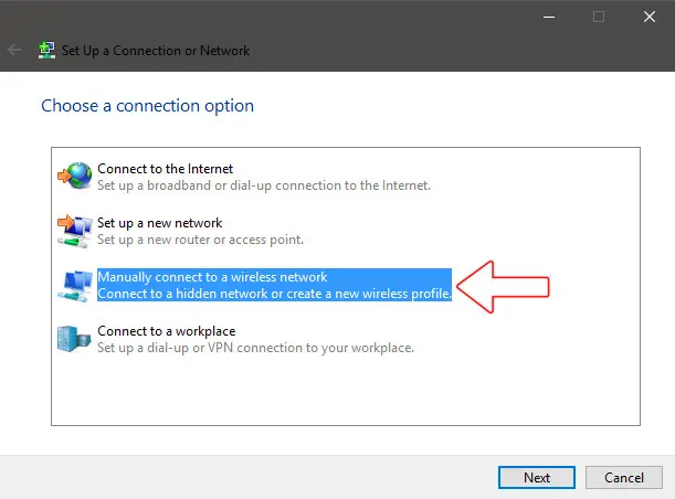 In the "Set up a new connection or network"window select the "Manually connecting to a wireless network" option to add a new network.
