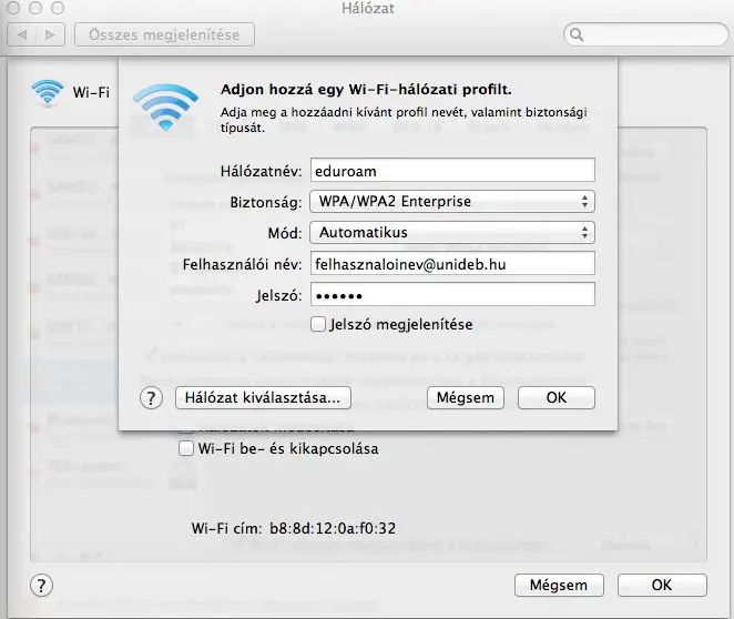 - Jelszó: hálózati azonosítóhoz tartozó jelszó
