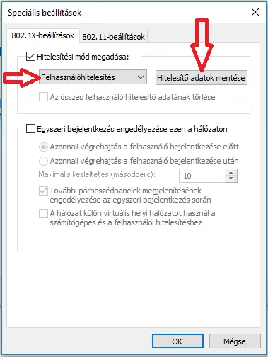 A megjelenő "Speciális beállítások" ablakban állítsd a Hitelesítési módot "Felhasználóhitelesítés"-re. Majd menj a "Hitelesítő adatok mentése"lehetőségre.