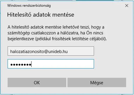 A "Windows rendszerbiztonság" ablakban add meg a felhasználói adatokat az alábbi formában: