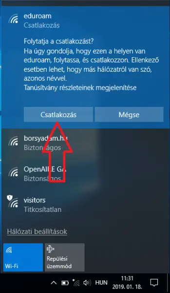 A megjelenő hálózat listában válaszd ki az eduroam hálózatot és nyomd meg a "Csatlakozás" gombot.