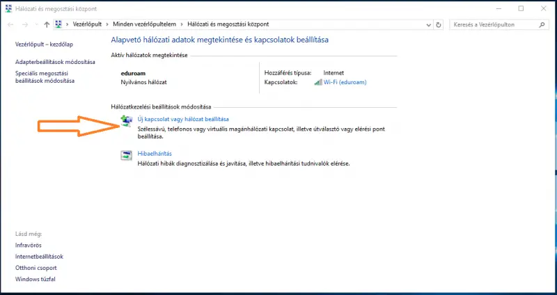 A megjelenő "Hálózati és megosztási központ" ablakban válaszd az "Új kapcsolat vagy hálózat beállítása" lehetőséget az ablak közepén.