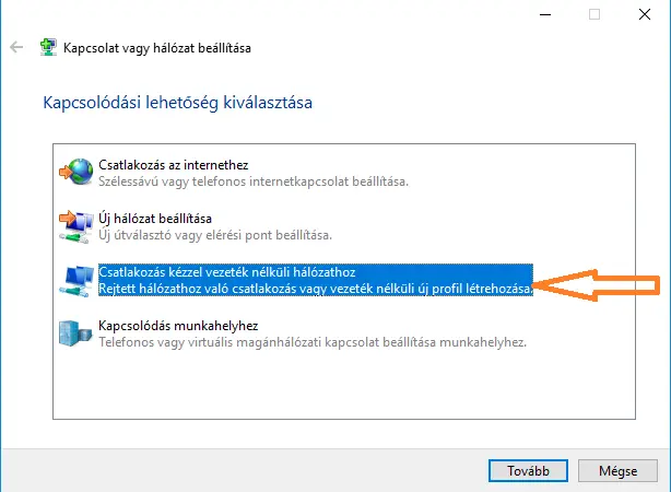 A megjelenő "Kapcsolat vagy hálózat beállítása ablakban" válaszd a "Csatlakozás kézzel vezeték nélküli hálózathoz" lehetőséget az új hálózat hozzáadásához.