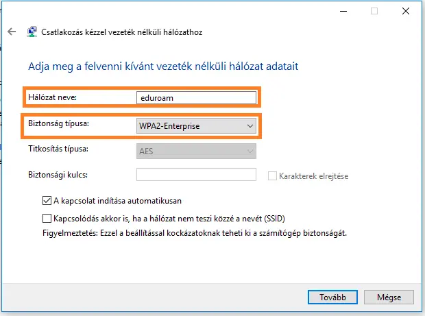 A "Csatlakozás kézzel vezeték nélküli hálózathoz" ablakban állítsd be a következő paramétereket: