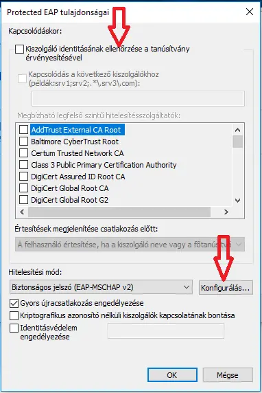 A "Protected EAP tulajdonságai" ablakban vedd ki a pipát a "Kiszolgáló identitásának ellenőrzése ..." opciónál.