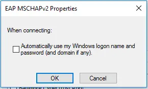 Az "EAP MSCHAPv2 tulajdonságai" ablakban vedd ki a pipát a "Windows bejelentkezési nevem .... " lehetőség elől.